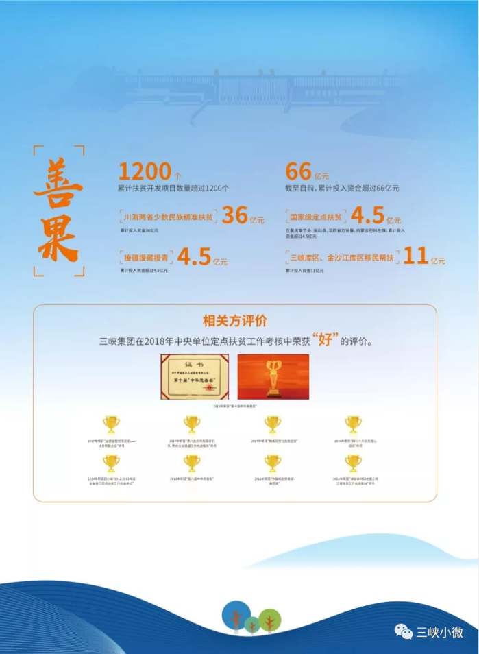 在展览中,av在线 紧紧围绕展会主题和定位,以“善若水、润天下”的社会责任理念为主线,通过“善心”“善行”“善果”“善愿”等四个板块,重点以图片、数据、视频等,简洁生动地展示了集团公司聚焦深度贫困地区和贫困群众,围绕产业扶贫、教育扶贫、基础设施扶贫、健康扶贫、安居扶贫等方面开展的一系列具有三峡特色的扶贫实践和主要成效,吸引众多观展者前来参观。
