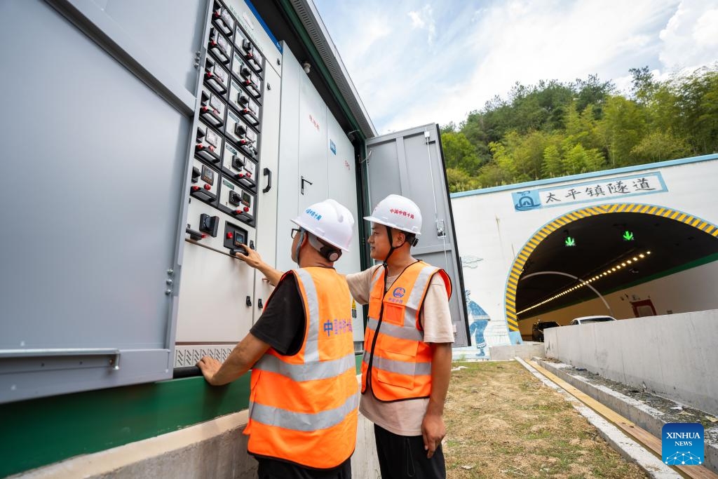 Technicians calibrate power supply equipment at the entrance of a tunnel on the Luci expressway in central China's Hunan Province, Aug. 19, 2025. The Luci expressway is in the final phase of integrated system testing. Stretching 79 kilometers, this four-lane expressway will serve as a vital tourist corridor, linking major attractions from the Three Gorges of the Yangtze River to Huping Mountain national nature reserve and the Zhangjiajie National Forest Park. (Xinhua/Chen Sihan)