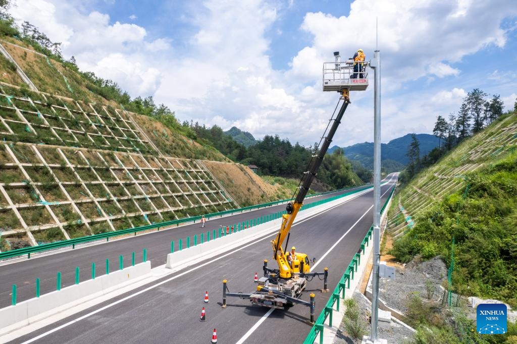 A drone photo shows technicians installing road monitoring equipment on the Luci expressway in central China's Hunan Province, Aug. 19, 2025. The Luci expressway is in the final phase of integrated system testing. Stretching 79 kilometers, this four-lane expressway will serve as a vital tourist corridor, linking major attractions from the Three Gorges of the Yangtze River to Huping Mountain national nature reserve and the Zhangjiajie National Forest Park. (Xinhua/Chen Sihan)