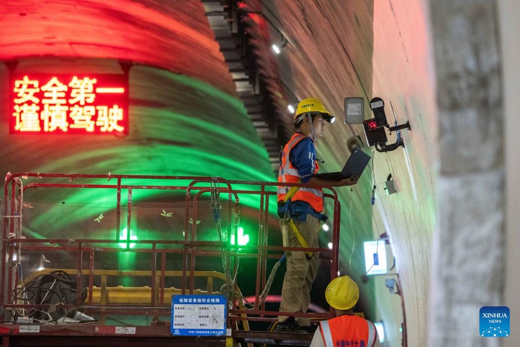 Technicians calibrate tunnel environmental monitoring equipment in a tunnel on the Luci expressway in central China's Hunan Province, Aug. 19, 2025. The Luci expressway is in the final phase of integrated system testing. Stretching 79 kilometers, this four-lane expressway will serve as a vital tourist corridor, linking major attractions from the Three Gorges of the Yangtze River to Huping Mountain national nature reserve and the Zhangjiajie National Forest Park. (Xinhua/Chen Sihan)