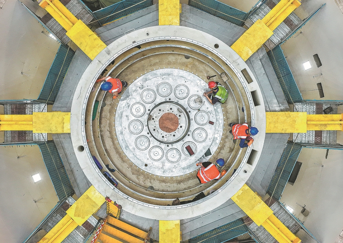 Staff members install bearings at the construction site of a pumped storage power station in Taizhou, Zhejiang province, on Aug 18. SUN JINBIAO/FOR CHINA DAILY