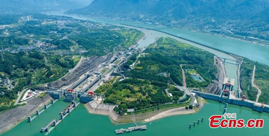 An aerial view of ships passing through the Three Gorges Dam in central China's Hubei Province during the scheduled maintenance of the ship lift on Aug. 25, 2025. (Photo/China News Service)