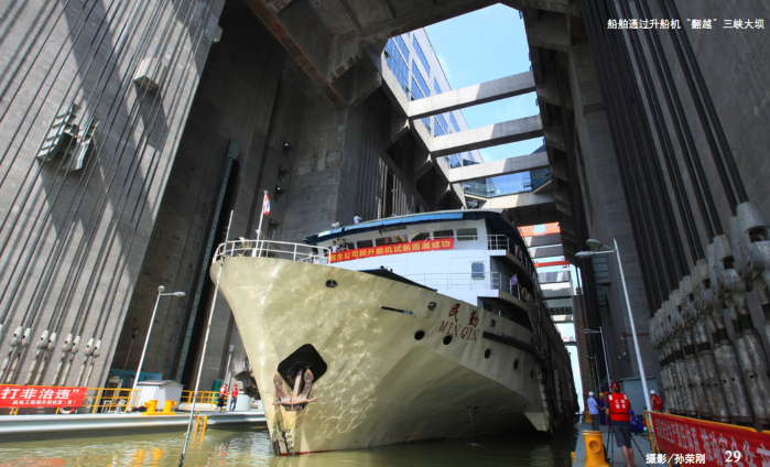 盛水承船厢是运载船舶升降过坝的载体。3.5米标准运行水深的承船厢总重是1.55万吨,根据阿基米德定律,船只驶入承船厢会排出同等重量的水,承船厢依旧保持在1.55万吨。由于运用物理学平衡原理在船厢两侧设置了同等质量的配重,提升或者放下承船厢,驱动机构仅需克服不平衡质量和运动阻力(约提升400吨左右重量的力,相当于承船厢总重的2.5%左右),船厢即可轻松升降。