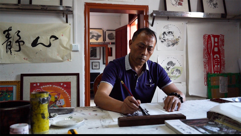 56岁的肖群,曾是邻村一名屠夫,年轻时因为兴趣曾学过绘画。“那个时候画画赚不了钱,为了养家,我就在村里干起了屠宰。”肖群说。尽管手握屠刀,心中对画画的热爱却没有就此熄灭。随着文化市场的活跃,在家人的鼓励下,肖群重新拾起画笔,求艺钻研,苦练技艺,逐渐在当地小有名气。