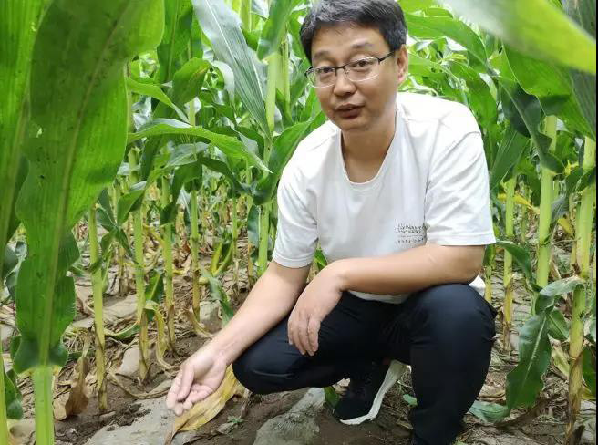 自然保护协会内蒙古项目主任林阔成在玉米试验田里讲解全覆膜双垄沟播技术