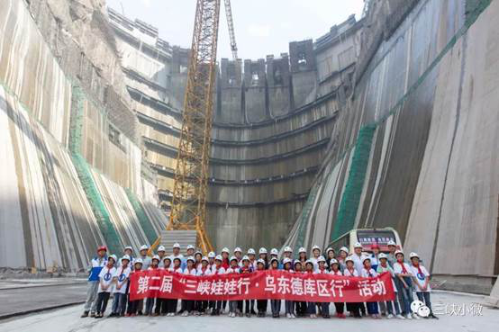 本网讯(袁磊)6月4日,乌东德水电站工程大坝水垫塘区域的施工依旧如火如荼。和往常不同的是,在轰鸣的机器声中,夹杂着些许稚嫩的惊叹:“哇,好高啊!”“好雄伟!”“真是壮观!”……
