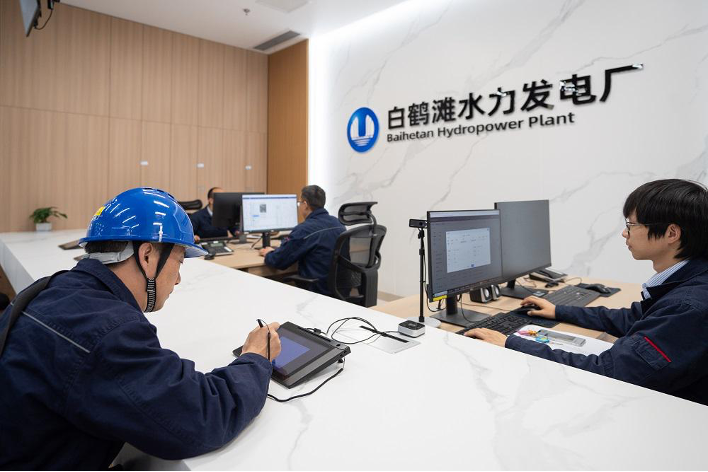▲ 白鹤滩电厂“两票”智能化管控系统构建了高度集成的“一站式”业务办理平台。图为白鹤滩电厂办票大厅内,运维人员正在办理“两票”。摄影:胡九思