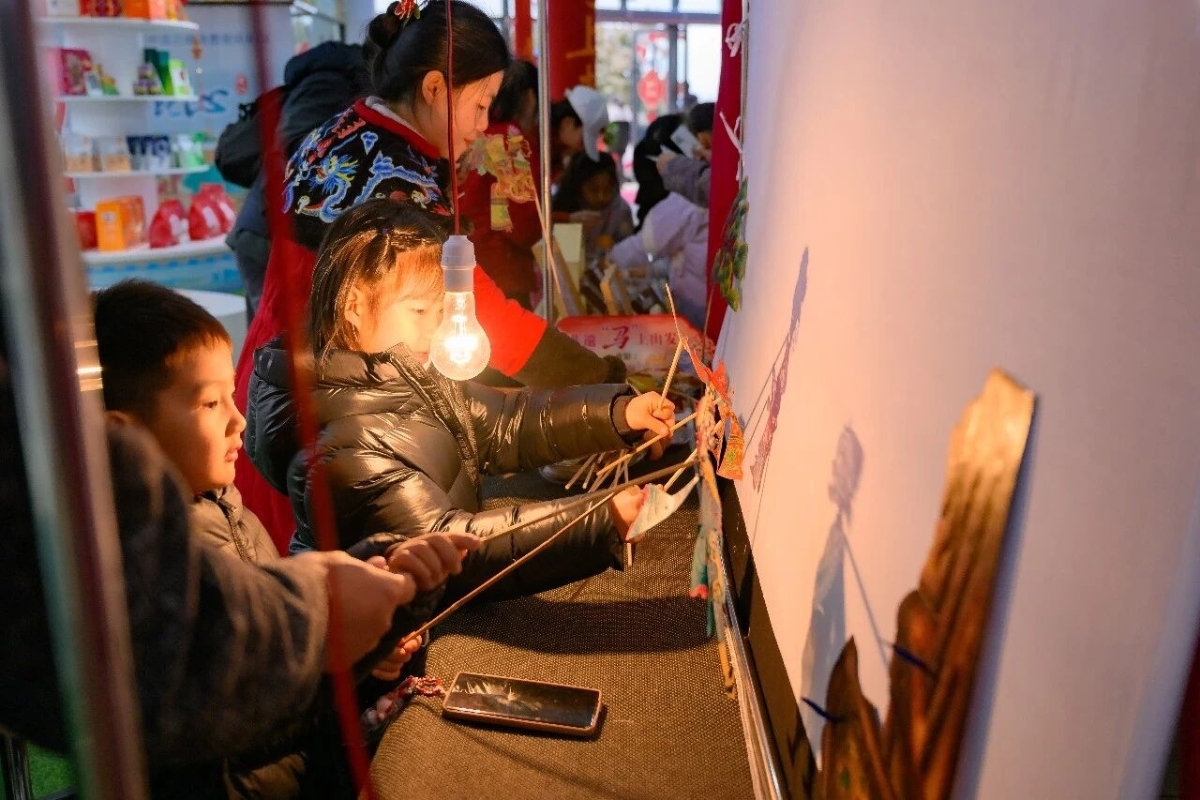 ▲ 小游客与非遗老师一起表演西陵皮影戏