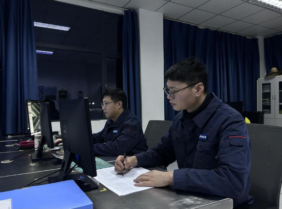 屋内,值班人员李浩杰和刘煜紧盯中控室电脑屏幕上的实时数据与监控画面,动态调整工艺参数。远处偶尔传来的烟花声,并未影响他们对运行情况的交流。