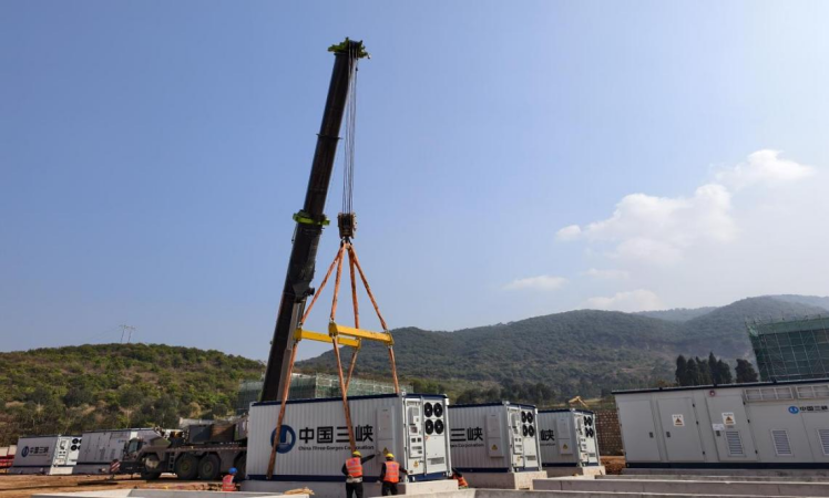 ▲3月4日,在云南弥勒西储能项目施工现场,施工人员正在进行电池舱吊装作业。