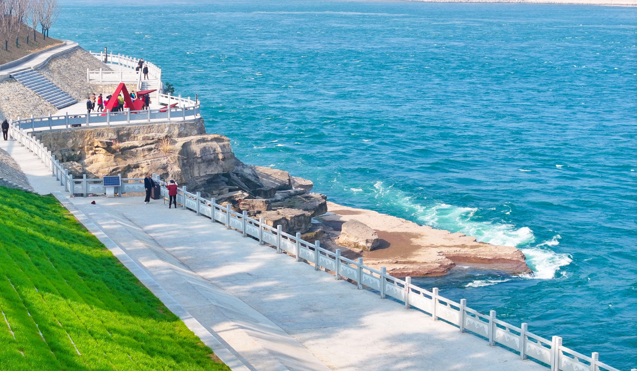 阳光明媚,江水湛蓝,银白色的葛洲坝工程横卧江中,滔滔江水拍打着江边岩石,激起白色浪花。生态步道上人流如织,或悠闲散步,或带娃嬉戏,或牵着爱犬漫步,阳光晴好,周边不少游客来此处拍照打卡。