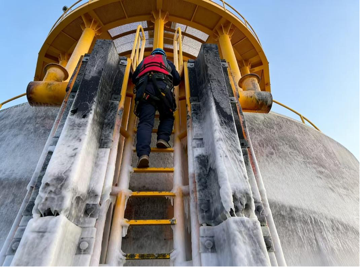 天寒地冻里,风机桩体已被厚重海冰包裹,运维人员需利用冰镐清理完爬梯积冰后才能攀登。这一天,他们连续奋战十几个小时,凭借过硬的专业能力,最终排除所有故障,风机恢复了运行。