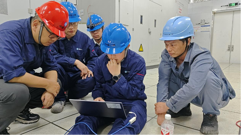 ▲ 峡沙海上升压站内,阳江项目部运维人员围在电脑前排查故障原因。