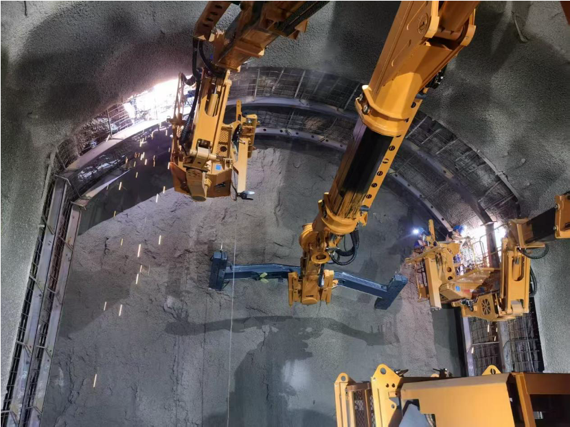 深入地下500米,空气湿润微凉,智能化多臂钻台车的钻孔声在洞室中回荡,钻头精准切入岩壁。
