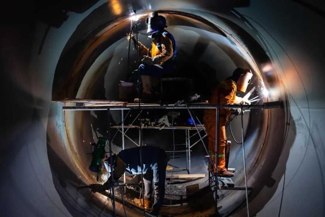 ▲ 在平坦原抽水蓄能电站1号引水系统的下平洞内,工人正在焊接压力钢管,巨型管节被逐一拼接,未来这里将成为坚固的输水通道。