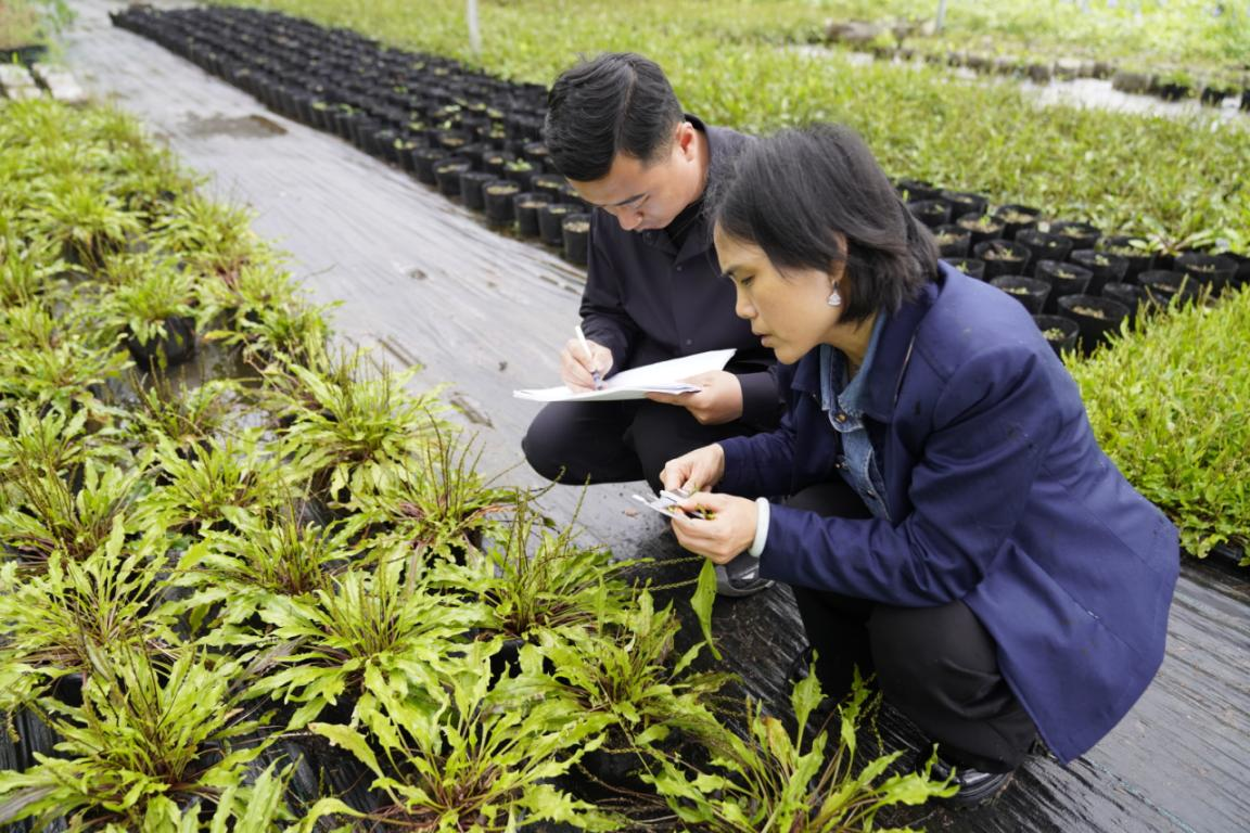 ▲ 金沙江向溪珍稀植物园内,科研人员正在对人工培育的丰都车前进行“体测”。
