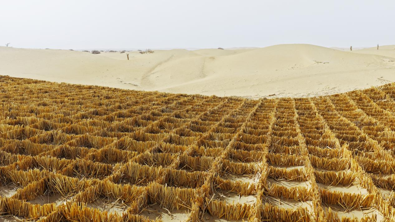 ▲ 在若羌新能源基地的生态治沙工程建设现场,立体防沙体系已初步形成。摄影:张源