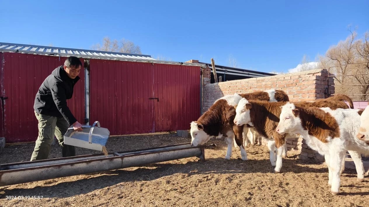 ▲牧民玛西毕力格正在给西门塔尔四代牛犊添加草料 摄影:徐强