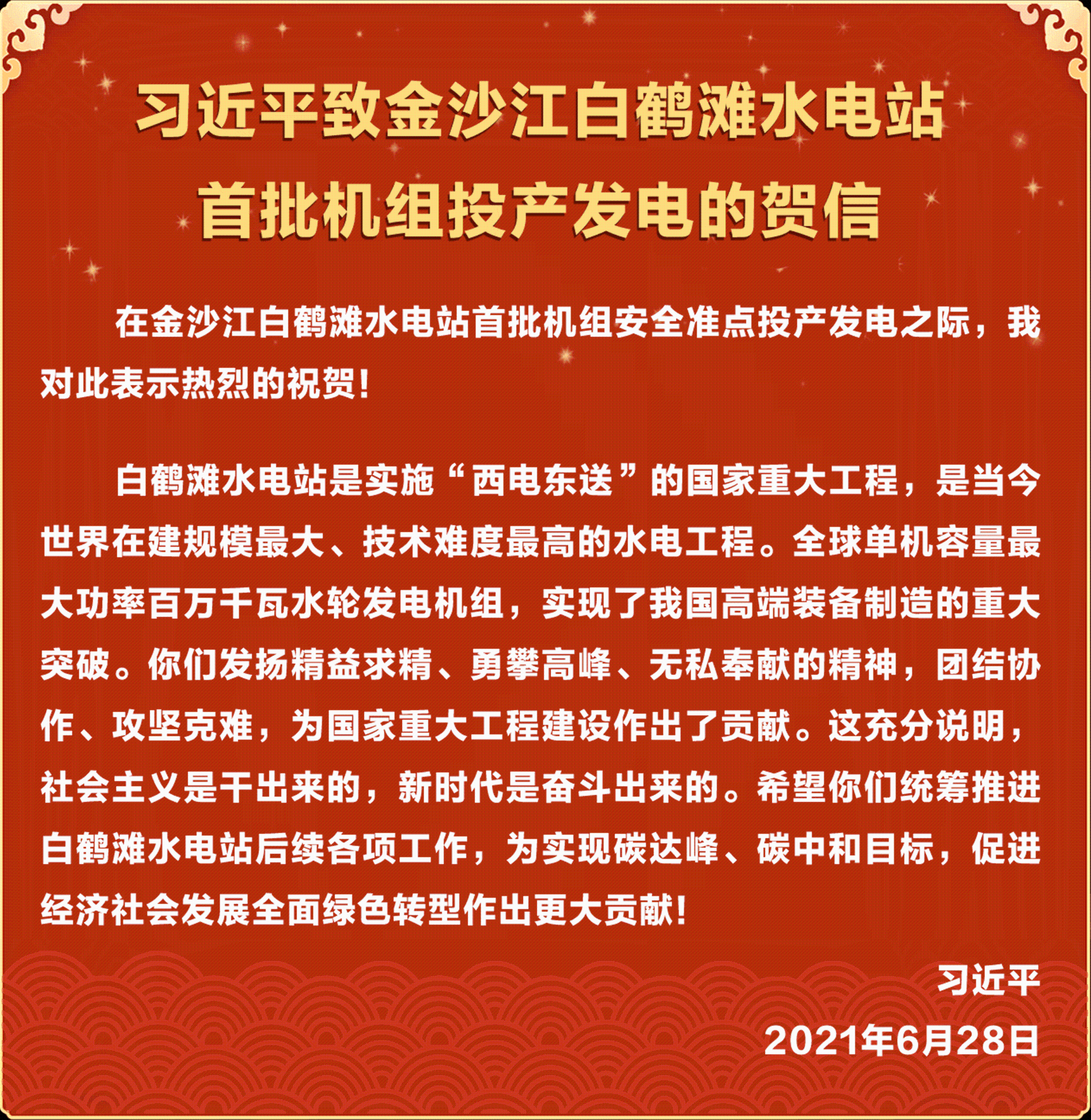 新华社北京6月28日电 金沙江白鹤滩水电站首批机组于28日安全准点投产发电。中共中央总书记、国家主席、中央军委主席习近平发来贺信,表示热烈的祝贺。[详情]