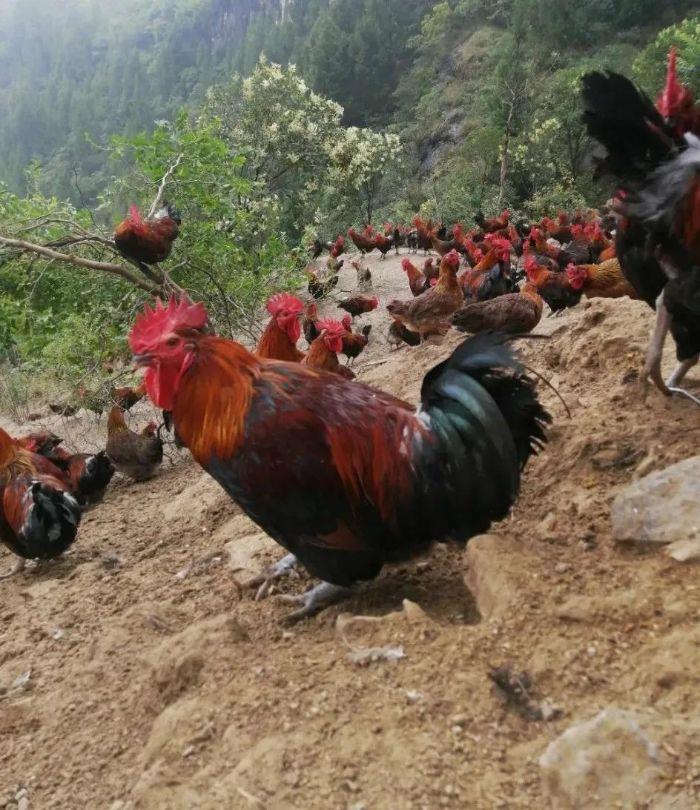 这次他们养的是瑶鸡,俗称跑山鸡,不在笼中圈养,而是在山里放养,出栏时间较长。