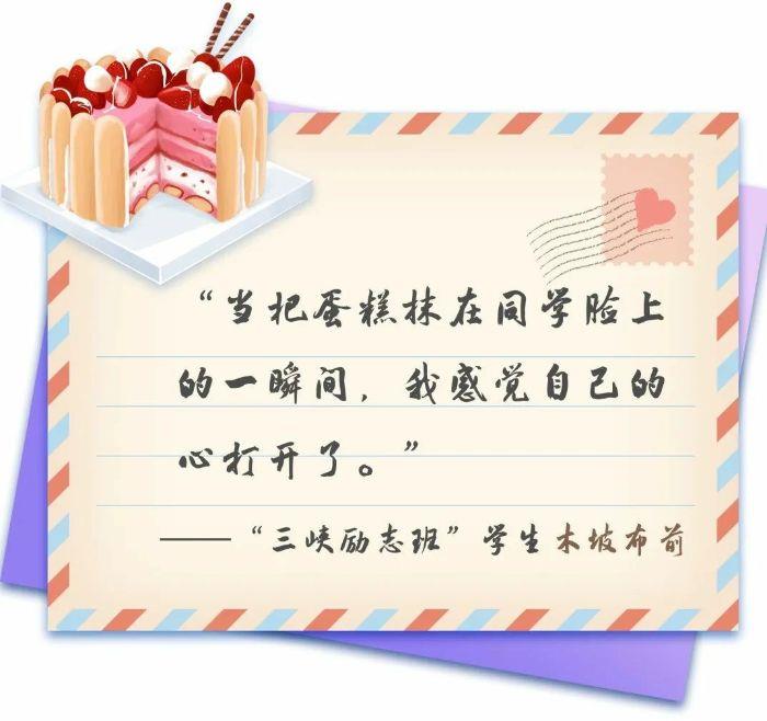 这是木坡布前十三年来过的第一个生日。“同学们都特别开心,闹成一团,还用手指头蘸上蛋糕上的奶油互相在脸上涂抹,” 木坡布前对那一天的场景记忆犹新,“我也被欢乐的气氛感染了,学着同学们的样子,我也把奶油抹到了同学脸上,那一瞬间,我感觉我和同学们的距离一下子拉近了。”第一次过生日,第一次游学,第一次演讲……木坡布前在“三峡励志班”遇到了很多个人生“第一次”,渐渐打开了曾经封闭的心灵。课堂上,他举手发言的次数多了起来;小组中,他参与讨论的声音也高了起来。以前,一道不会的数学题,木坡布前要花上几个小时的时间自己想,现在他会主动寻求老师和同学的帮助,很快就弄明白了。