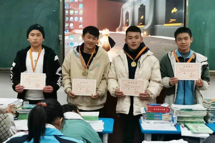 ▲ 杨里布(右二)获校运动会田径比赛第一名