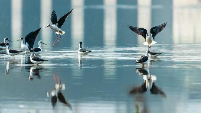 同样,经过治理和修复的九江市城区水系“大动脉”十里河,碧波荡漾、绿树成荫,曾经消失的黑翅长脚鹬也再次回归。