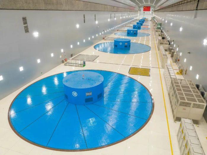 在“迷宫”中乘车绕行大约3分钟后,记者抵达了左岸厂房,见到了9台单机容量77万千瓦水轮发电机组。在金沙江的另一侧,还有9台机组对称布置。