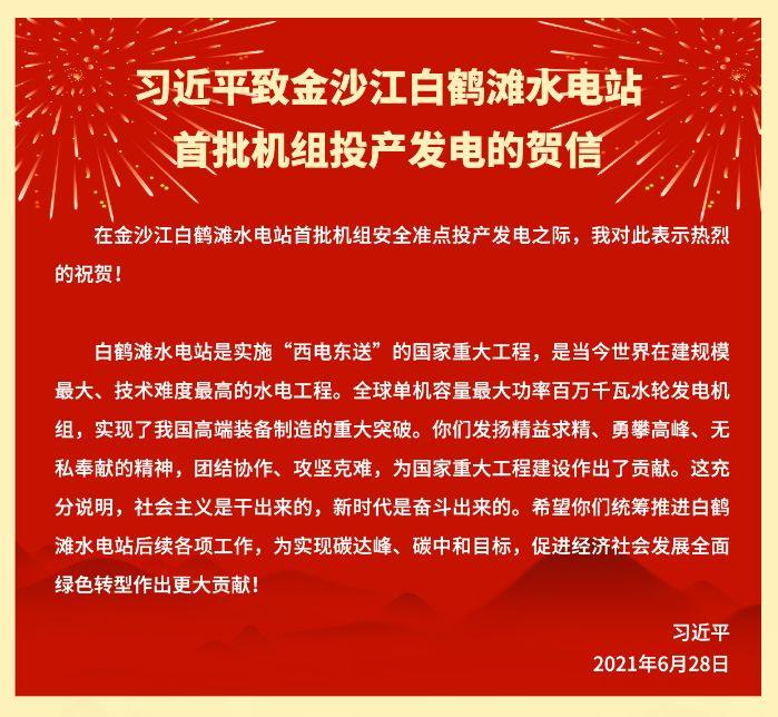 新华社北京6月28日电 金沙江白鹤滩水电站首批机组于28日安全准点投产发电。中共中央总书记、国家主席、中央军委主席习近平发来贺信,表示热烈的祝贺。