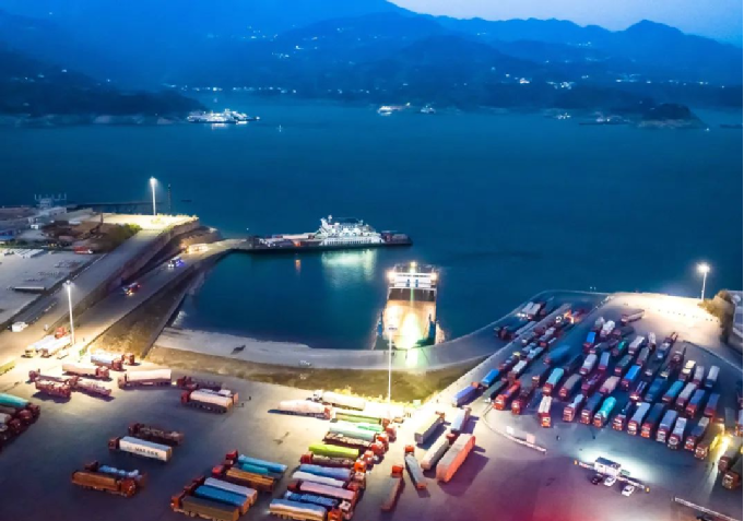 ▲ 货车在三峡大坝上游湖北省宜昌市秭归县银杏沱滚装码头上、下船。滚装运输方式既能节省时间,又能降低成本,每天进出银杏沱滚装码头的货车近千辆。摄影:新华社 郑家裕
