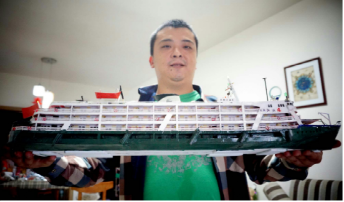 ▲ 长江船舶爱好者王轩和他制作的“江渝4”号客轮模型。此船换色改名后,现收藏于奉节县诗城博物馆
