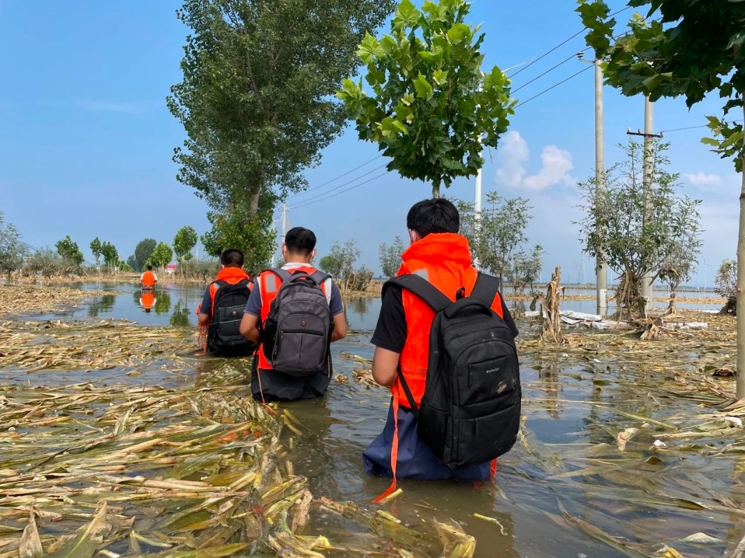 遇到漂浮物过多时,宋要伟干脆跳进及腰深的洪水,在艇前开路。