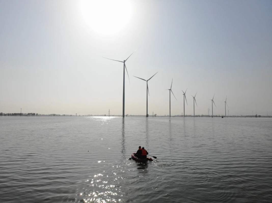 8月初的豫北大地暑气灼人,空气中弥漫着洪水退去后特有的酸腐气味。突击队队员们驾驶着皮划艇,在升压站和风机间往返穿梭上百趟,完成了升压站预防性试验和第一批25台风机检修和重要设备的运输、安装工作。